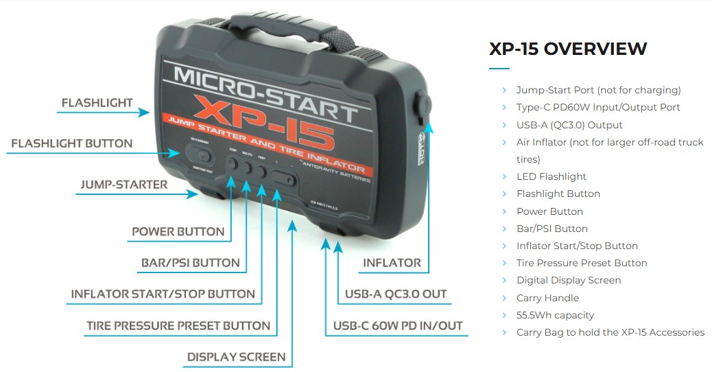 The MICRO-START XP-15 is your Jump Starter, Personal Power Supply, Tire Inflator and Voltmeter, all in one ultra compact, portable device. It can jump-start Diesels up to 6.7L as well as gas engines, and inflate passenger car and Small Truck tires and pump up other small volume objects. Additionally it can power or charge USB devices with its USB-A Quick-Charge port and a USB-C PD 60W port for ultra fast charging and recharging. Take Portable Power and the ability to Jump Start your vehicles and maintain tire pressure wherever you go. Take us on your next adventure!