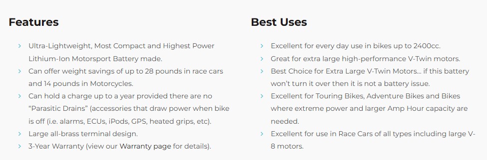At a massive 720 Cranking Amps and extremely compact size, the Antigravity YTX12-24 Lithium Battery offers the most power in the smallest package you can find for motorsports. There is no powersports battery model on the market that has this type of POWER! This lightweight lithium battery is best used for applications where Extreme Power in an ultra compact size are desired such as Large V-Twin Motors, Touring Bikes, Adventure Bikes and Race Cars. The YTX12-24 does not have our RE-START built-in jump-starting feature but offers a deeper level of Discharge for more usable Capacity and more Power for Cranking.