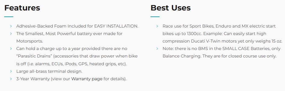 The Antigravity SC-1 is the smallest, most powerful Motorsport battery in the WORLD!!! This battery is designed for Race Motorcycles and Powersports vehicles up to 1300cc in competition use only. It has a lower capacity than our 4-Cell model but offers twice the power!
