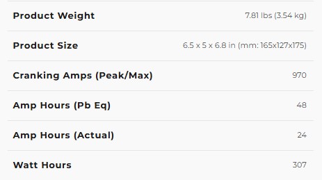 - 48 Amp Hours (PbEq), 24Ah (Actual) / 307Wh