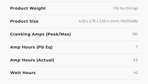 - 7 Amp Hours (PbEq)/ 3.3Ah (Actual)/ 42Wh