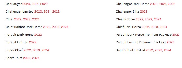 Please Choose Your Model PV3Please Choose Your Model PV3, Challenger 2020-22, Challenger Dark Horse 2020-22, Challenger Limited 2020-22, Challenger Elite 2022, Chief 2022-24, Chief Bobber 2022-24, Chief Bobber Dark Horse 2022-24, Chief Dark Horse 2022-24, Pursuit Dark Horse 2022, Pursuit Dark Horse Premium Package 2022, Pursuit Limited 2022, Pursuit Limited Premium Package 2022, Super Chief 2022-24, Super Chief Limited 2022-24, Sport Chief 2023-24